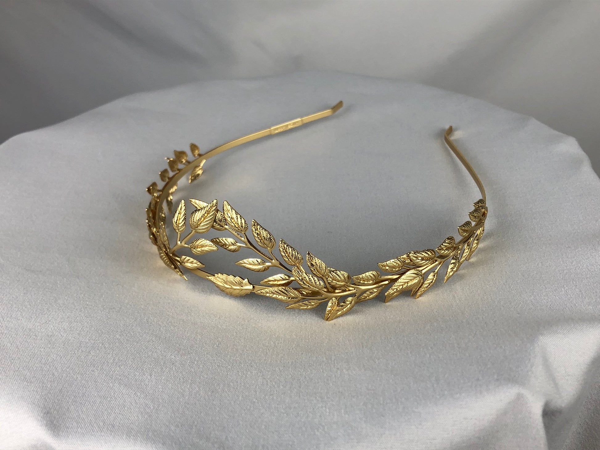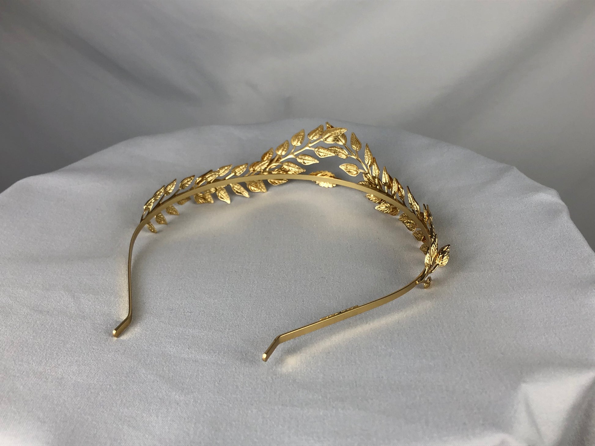 Wear a crown fit for the goddess that you are, featuring golden laurel leaves coming to a delicate point at the forehead.